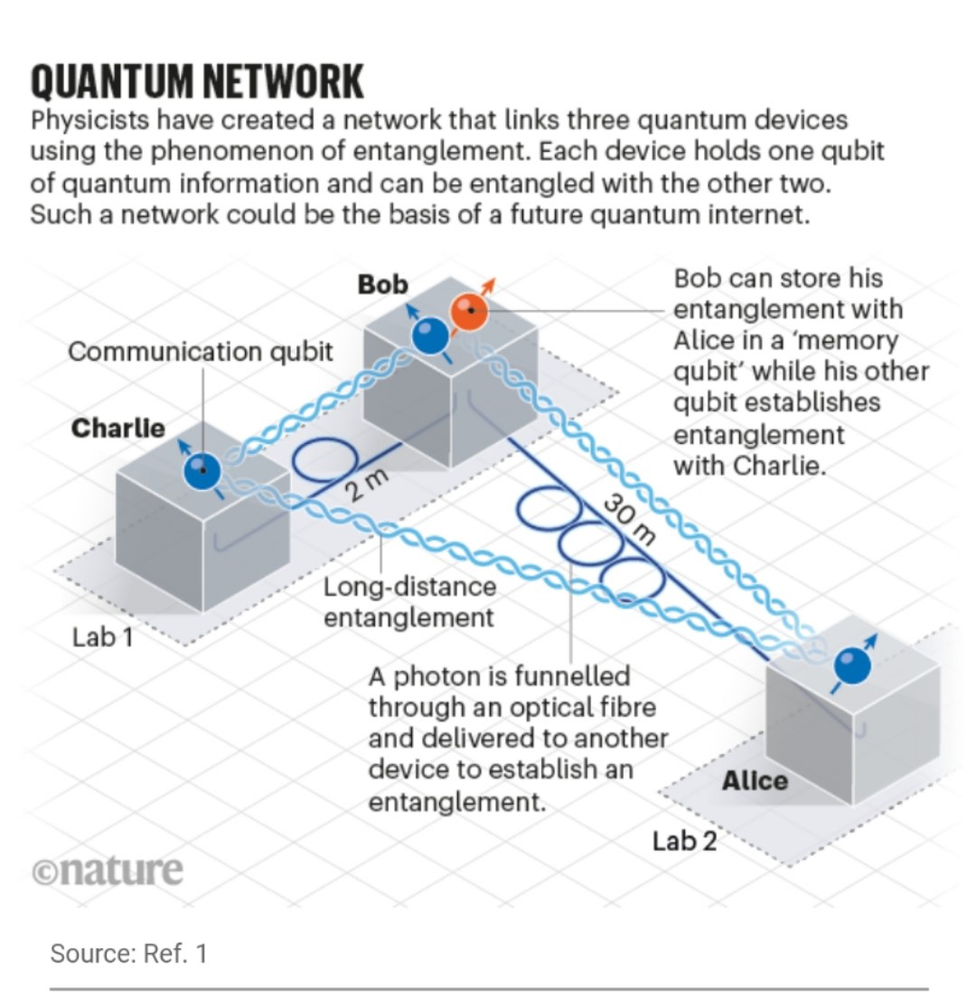 据《自然》新闻2月17日报道,荷兰代尔夫特理工大学近日在量子网络领域有了新进展。该校物理学家将三个量子设备连接在一个网络中,向未来的量子互联网迈出重要一步。