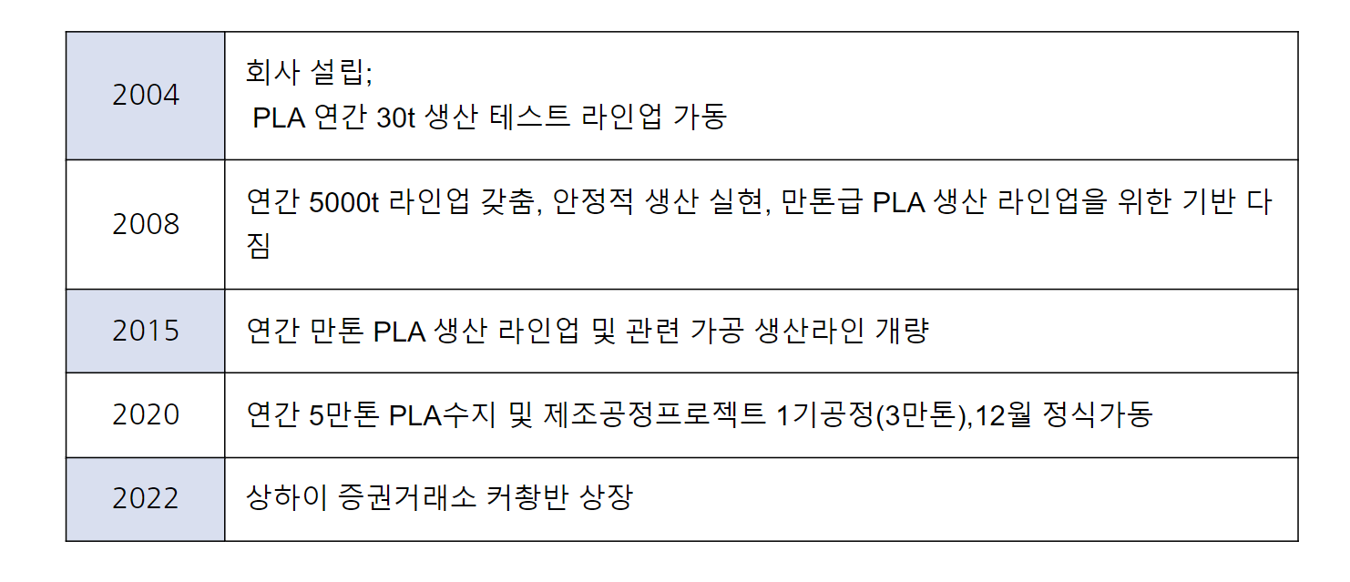 회사 주요 제품은 폴리락트산이다. 폴리락트산(Polylactic acid, PLA)은 식물에서 추출할 수 있는 새로운 분해성 물질로 환경에 무해하며, 사용 후 자연 미생물에 의해 완전히 분해되어 이산화탄소와 물을 생성하여 환경을 오염시키지 않고 환경 보호에 더 도움이 되는 소재이다. 폴리락트산은 다양한 플라스틱 제품, 포장 식품, 패스트 푸드 도시락, 부직포, 산업 및 민간 직물, 의료용품 등으로 가공되어 산업에서 민간에 이르기까지 널리 사용될 수 있다.